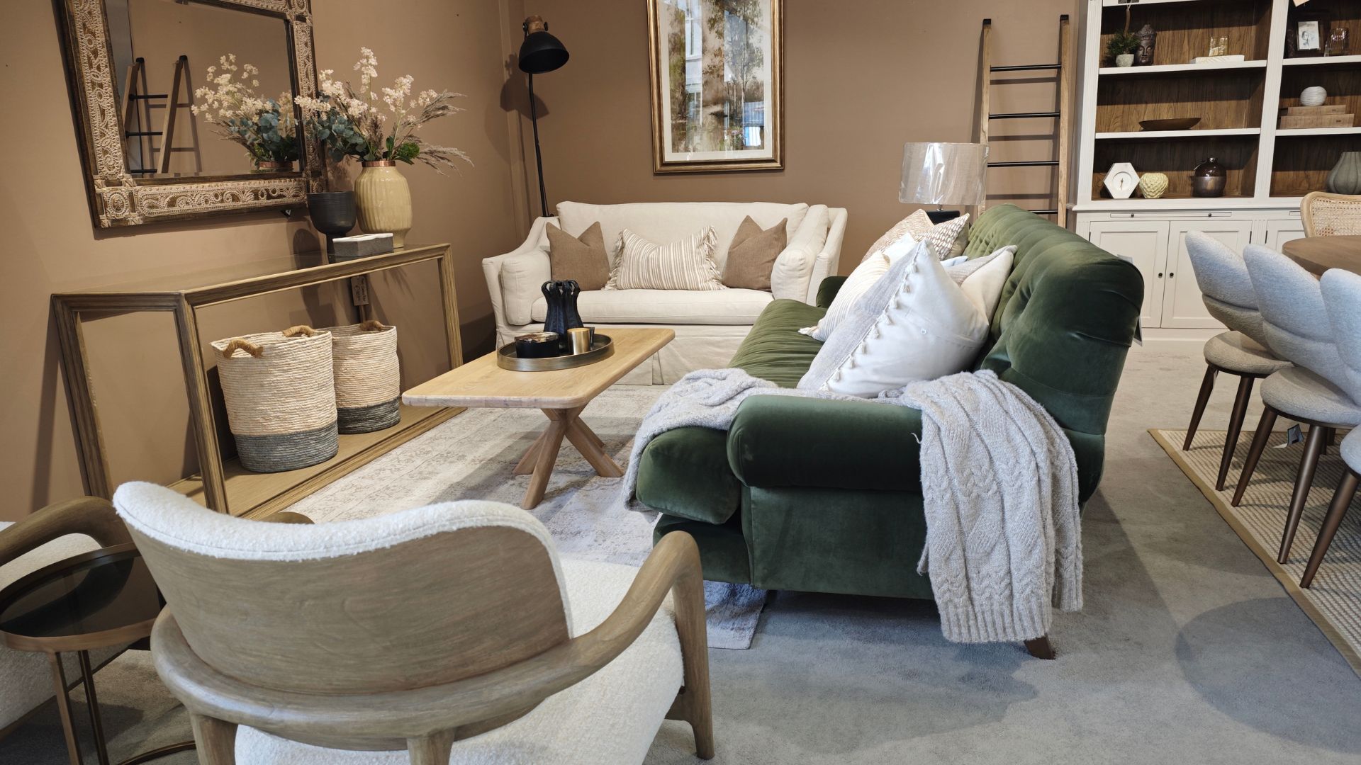 The foundation of the space starts with the seating. The soft neutral sofa brings a relaxed, timeless feel, while the deep green velvet sofa adds richness and depth. Together, they create that balance between lightness and structure, fresh for spring/summer, but still substantial enough to carry through the seasons.